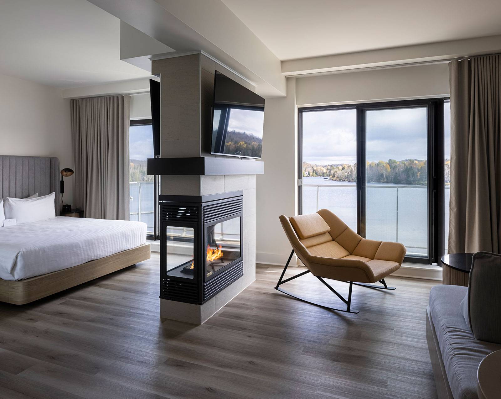 Suite exécutive 1520, vue sur le lac Dupuis et les jardins, chambre fermée, lit King et lit de jour, 2 grands balcons, cuisinette et foyer